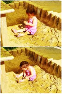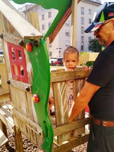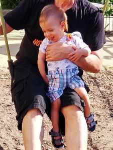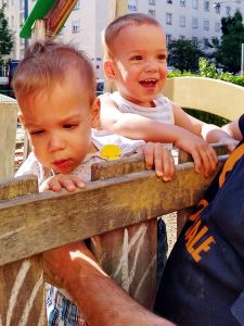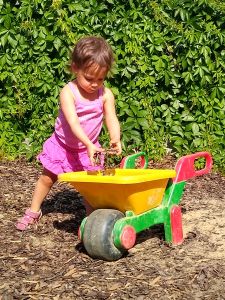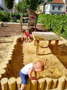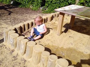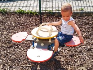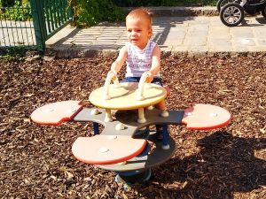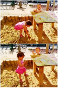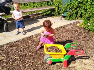 They had been in the strollers for a while at that point, and so I looked on my phone where the nearest playground was, and we started walking. It was really small, but nobody was there, and it was perfect for their age. There was also no sun protection, and it was really hot. There was a little slide, but it was made of metal which was burning hot and would have burnt their legs, as they were wearing shorts. Tammy was really busy with the wheelbarrow, filling it up with mulch. She was so concentrated and determined, and filled it to the brim! Sammy and Emmy got to swing a little bit, and Emmy was the first to find the sandbox, and Tammy then followed him there and became as concentrated and busy with the sand there. She really enjoyed it.