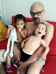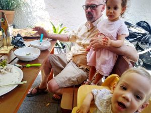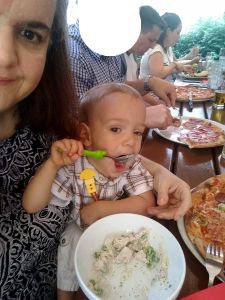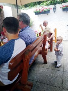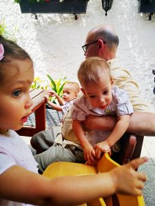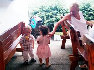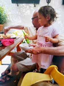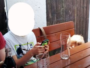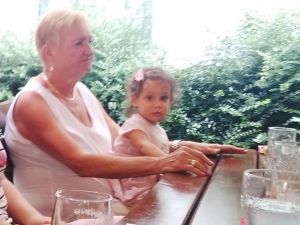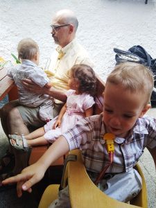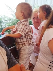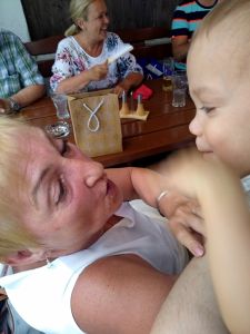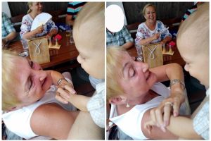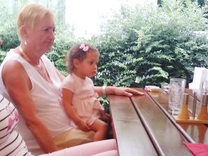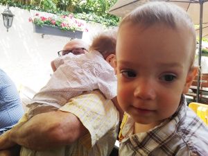 It was really hot, especially when it's an old subway train that comes as they don't have air conditioning. After the subway we took a tram, and then we had to walk a bit. We got to the restaurant right on time, at noon. My Mom and my brother had had their birthday during the strict lockdowns, and so they had their dinner with the whole family at the restaurant today. We were sitting outside in the coutyard, but under big umbrellas, and it was extremely hot, with no breeze whatsoever. The kids were tired and hungry. And Grandma was the only person they knew well. She was also the only one spending any time with them at all. Right when we got there, Emmy immediately stayed with her, and Tammy then joined him and stayed with her for a while, while Emmy came back to where I was. I think this is just a wonderful picture of my Mom with Emmy.