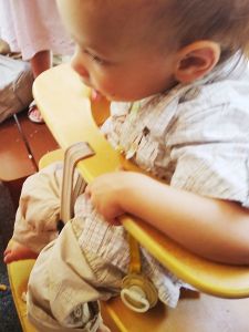 And that's when the challenge started. I was getting frustrated and stressed and found myself wishing someone at the table would step in to help us, but we had to manage feeding three babies and ourselves by ourselves, and it was not easy at all. Sammy sat in the only high chair they had, but it had no tray. I had Emmy, and Randy had Tammy, and everyone was making a mess. Emmy kept reaching for stuff at the table, like my knife and the pizza, and Tammy ended up pushing my glass over, so I lost what I had to drink. He also ate out of his bowl with the spoon, which was good, but messy. Somehow I managed to eat my pizza, but I was ready to take them home and to bed. Nobody was talking to us anyway, and they were tired. As soon as Randy was done, Emmy was the first one by the stroller, wanting to get in. We strapped them all in and said our good-byes and left at 1:30 pm. Normally they're all asleep at that time.