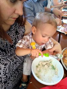 I got some snacks out as it was 12:30, an hour later than when they normally eat, and they were were hungry. Thankfully the food arrived a few minutes later. Randy and I were each eating a pizza, and I had ordered chicken with rice and peas for them. They were so nice and brought us three bowls and spoons, and I put some food in the bowls. An adult dish is the perfect amount for three kids.