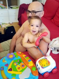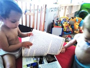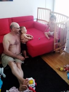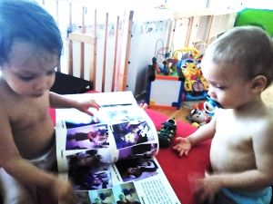 Emmy was really clinging to me, and Sammy wanted me to hold him as well. Every time I tried to sit down with Emmy on my arm, he'd go frantic. I still don't know why he insisted I'd keep standing instead of sitting down, and what difference it made to him. One time I sat down anyway, right next to Sammy who was fussing, and he stormed off in anger, crying hard and throwing a fit. I filmed him and uploaded the video. After a while he did come back to me. However, I was never able to leave, but we both stayed with them until 5:30. Emmy was on my arm the whole time, not wanting to leave for some reason. One time he was practicing pushing the light switch buttons on the floor lamp. And just before I left we were looking at photo books of them together, which especially Tammy enjoyed, and she was upset when I closed the book and put it back up.