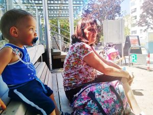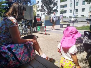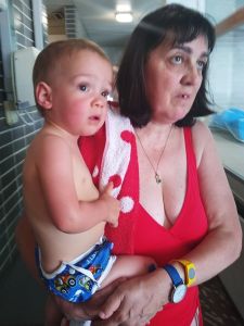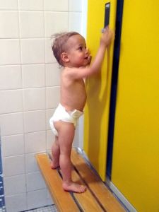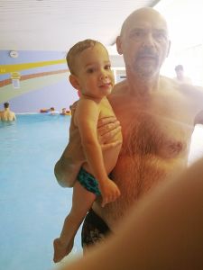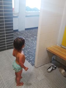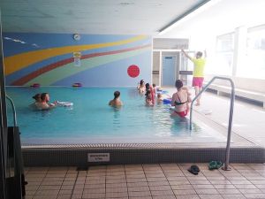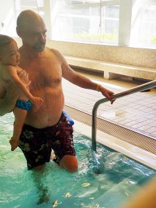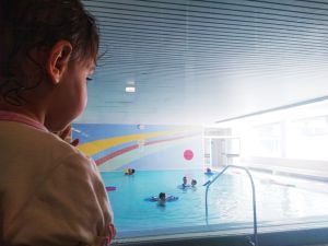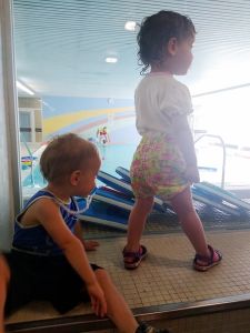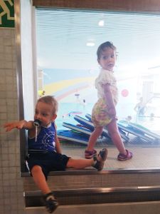 And so we left on time at 1:30, walked to the tram stop, which is a little bit of a walk, and then had a long ride in the hot tram. Once we got off, we had to walk some more. It was a really hot day today. We got to the swimming pool 3 minutes early and sat down at the entrance, where we had to wait for the teacher to come and check everyone's Covid test. He came late, checked everyone, and together we went inside. We had never been to that pool, and I think it's not a pool for anyone, but just for swim classes. We went to the locker room, where we put their swim trunks on, and then went to the pool. I think we were about the last ones to be ready. Emmy was terrified right away. 9 months is a long time at that age, and it had been 9 months since their swim class was canceled because of Covid. It's only now they can go swimming again. Emmy is rather fearful anyway, and he was clinging to Sonja for dear life.