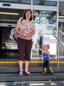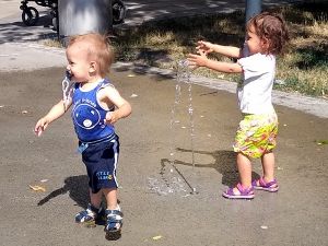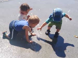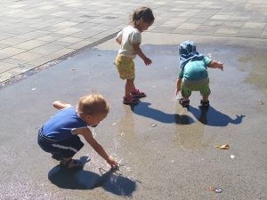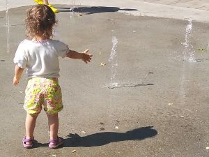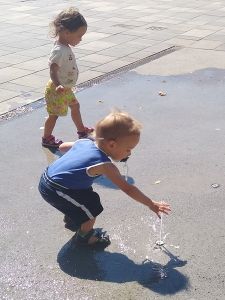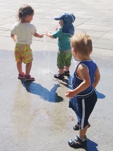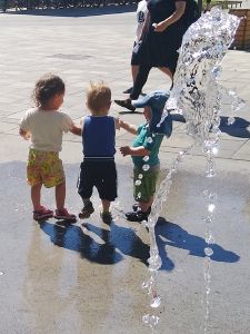 I think we were the last ones leaving as well. They absolutely did not want to go into the strollers, especially Tammy, and so I held their hands, walking with them. We had not walked far, when we got to a little area where water was coming out of the ground, and two toddlers were already there having fun with it. Of course our two immediately joined in, having lots of fun putting their hands into the water. It kept changing, the height and which hole it came out of, making it even more fun. I finally got out Sammy to join in the fun, and then the water stopped. Sammy had missed out, and we continued to the train station.