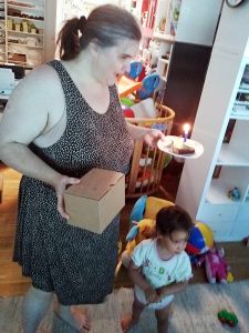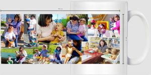 By 4:30 we were back home. We took their shoes and pants off, and everyone went downstairs. Then I cut the cake Randy had bought and put a candle on top and took the plates downstairs. I lit the candle, and we sang HAPPY BIRTHDAY for Sonja. Then she blew it out and opened a gift. When she saw the gift, tears came into her eyes. We gave her a mug with pictures of her with the kids. She was very touched and expressed again how much she loved and appreciated us all, and how much the gift meant to her.
