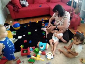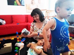 After lunch, I cleaned them up, dressed them, and Tammy and Emmy went downstairs with Sonja to play, while Sammy went to bed first - for the first time in his brother's bed, which made no difference to him, nor his brother. It was not even 12 yet. Then I went to get Emmy and put him to bed. He needed a little help, and so I stayed for a while, and he fell asleep fast that way. That was great news. Then I went to get Tammy and put her to bed. She was doing her typical running up and down and playing. Usually I leave her be, but there was only an hour left until we needed to leave. So I kept encouraging her to lie down and sleep, and once I came and stroked her head for a while, it did the trick. I was glad she got to sleep early as well, though she now only had 50 minutes to sleep.