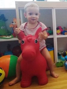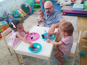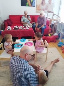 I had not seen my Dad in exactly a year. They said it was because of Corona. The kids were at the door, when they arrived, and Emmy stretched out his hands as if he wanted Grandpa to pick him up, which he didn't. We then gave them a tour of the apartment, and then went downstairs to sit down for cake and coffee and fellowship. My Dad's girlfriend is really good with kids, even though she doesn't have any, while my Dad is not as comfortable. I was 5, when he left us, and my brother 2, and I have only seen him a handful of times in my life since. In any case, everyone was having a great time. The kids don't care who it is who visits, they play and have fun with everybody. They were reading books, playing ball, playing the xylophone, eating cake, dancing, keeping everyone on their toes, especially us. Towards the end they also went outside, with their cars, and my Dad and his girlfriend left from downstairs. They were waving goodbye, as they were walking away.