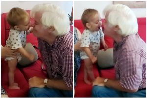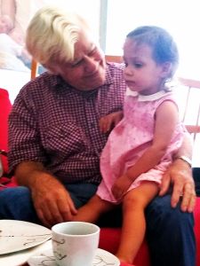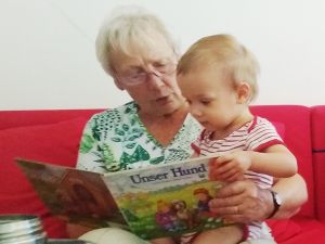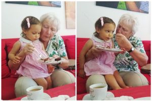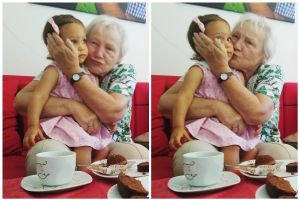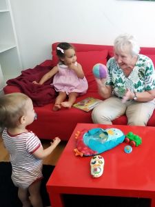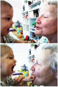 I opened the balcony door, and we went outside. I had cooled off big time. Tammy still wanted me to hold her, but she ended up eating most of the food, as Emmy did not want to eat. They were running around and were greeting the people walking by, who rarely return the greeting. They were done, and I dressed them again, and then the door bell rang. I had already been telling them that "Mama Opa" was coming today, and they arrived before 3:30 pm.
