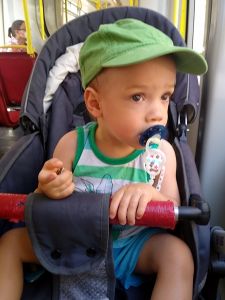 Their tiredness, and maybe also being wet, made our trip until we got back home very challenging, to say the least. They didn't want to be in the strollers. We had to wait quite a while at the tram stop. The first tram was an old one again, so we had to let it go. There were other trams and busses coming, and every time Emmy insisted we'd get on. On the way to the pool, they had refused to eat, but at that point they were ready to eat the snacks I had with us. Unfortunately much of it ended up on the ground.