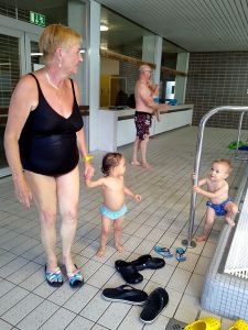But we still missed our tram. However, seeing it leave we saw that it was one of the old trams that we cannot use anyway with our strollers. However, the trams come in 10 minute intervals, so we arrived at the swimming pool late. With Sonja out of town, my Mom filled in for her, and we hadn't seen her in nearly a month anyway. The teacher was already standing at the door and had let everybody else inside, we were the last ones. We went to the changing rooms, put their swim trunks on, and in we went. Randy went to the bathroom, so I went into the water with both boys, while my Mom had Tammy. Emmy was clinging to me like crazy again, while Sammy was laughing, having fun. Randy took Sammy, once he returned. Emmy was clinging to me the whole time. I tried to get him to get more comfortable and loosen up. When I'd jump into the air with him, he'd love. A few times I was able to get his body at a short distance from mine, but only for a short time. He was just scared, after a 9-month Corona break from swimming. The teacher put a platform on the water again, and I did get him to go on it and "jump" down. As for Tammy, she's getting really comfortable in the water again and was doing great.