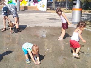 We went into the showers that Emmy now even likes, which he didn't before we started up swimming again. Then we dressed them again and left. Leaving the pool, we were walking towards the tram stop with Grandma and reached the place where water is coming out of the ground that they enjoyed so much last week. They ran right into it, playing with the water, having so much fun. Randy got Sammy out of the strollers, so he could join in as well. They were totally soaked, from top to bottom, water running down Emmy's face, but they loved it. They were upset, when we put them back into the strollers to leave. And they had to say good-bye to Grandma.