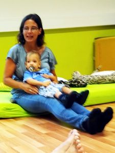 It was their third class, and they are getting more and more comfortable, which was obvious today. The kids actually walked themselves in a circle when asked, at least at times, and participated more. We started off sitting on the floor and moving our legs to songs, and the teacher had Sammy on her lap. At the end of the song we'd move our legs to the side so the kid would fall to the ground, and Emmy was the only one laughing each time (except for the one time I filmed it), amusing all the other mothers there.