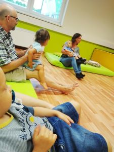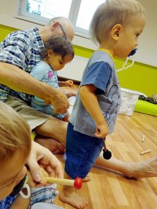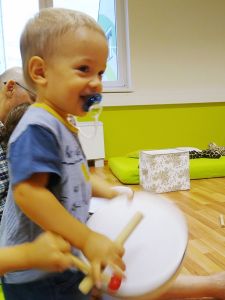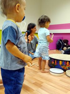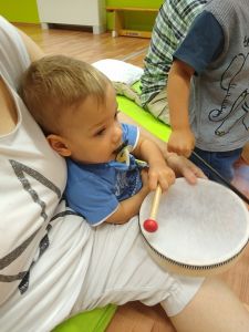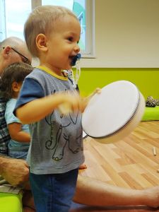 Then the teacher got some tambourines and drums out and did a few songs with them, and Emmy had the most fun making noise with it. In fact, the teacher had a huge drum in the middle, and Emmy walked up to it and hit it hard, once again amusing everyone. Sammy also enjoyed drumming.