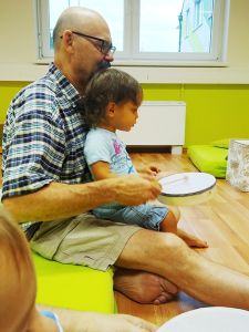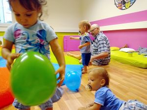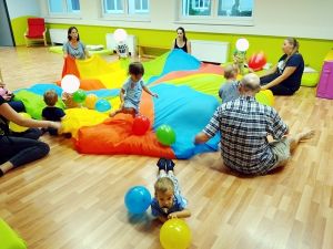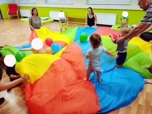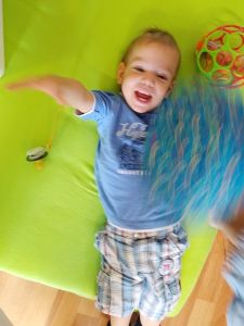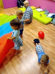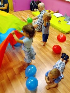 The teacher did some songs, where everyone was walking in a circle, or running, or stomping their feet. Then she got out a parachute, and we surrounded it and grabbed it, moving it up and down, which was lots of fun for the children. Emmy walked under, and Tammy on top, especially once the teacher put balloons on top. Sammy was also chasing balloons and happy, when he caught one.