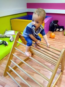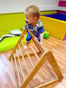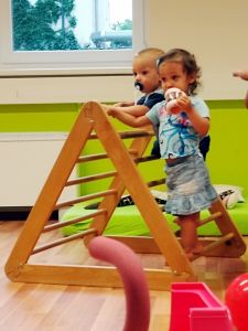 Then it was playtime. They could get any toy they wanted out of the closet to play with. The teacher set up this triangular ladder, and both Tammy and Emmy climbed on top and back down. They also played with all kinds of other toys.