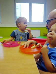 At 6 pm they came upstairs to eat. Emmy was especially tired and had been crying for a while, and was crying at the table. So I gave my best to entertain and distract him, and it worked. We all had lots of fun. They hadn't eaten much, but finished pretty much everything on their plates in the bathtub. Then it was bedtime.
