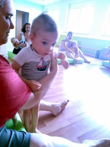 The class started at 9 am and lasted for 90 minutes. There were six kids in total (due to Corona), and Sammy was allowed to be there without paying because of his condition, so he was the 7th kid. It was a nice lady who was the teacher. We had to show her our Covid test, and then she got started. First we all sat down on the mats on the floor. I had all three kids with me who were curiously and cautiously watching everybody, trying to figure out what was going on. Age-wise they were on the upper end, compared to the other kids. The teacher started with a song that was welcoming each child separately. She included Sammy from the beginning, which was great. Then she did another song, where they had to stand, and she was doing motions. Our kids were just standing there and watching her. It did remind me of the program at church, so our kids have seen this kind of thing before.