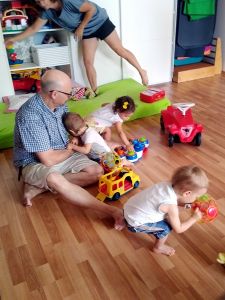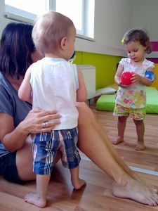 The teacher did not go on for long. The kids weren't too interested or participating, so she decided to do play time early. It was the first time after all. They had LOTS of toys, so that was paradise for all the kids there. Soon ours were playing as happily as if they were at home. They had these different shaped mattress blocks, similar to what Sammy is using at physiotherapy, so Randy went with him over there and started working with him on going up the stairs. Tammy and Emmy were riding cars, going through the tunnel, and Emmy was having fun with the teacher, our little comedian and casanova. He has already won her over. They were playing with toys, and even with everything there, Emmy wanted to go up on the window sill and look outside (just the courtyard). All three were having great fun. Then the teacher called everyone back together into the circle, and she did a snake song. Kids started coming up and grabbing her snakes, including Tammy. Then she did a good-bye song - the same one they used to do at swim class. And then it was over.