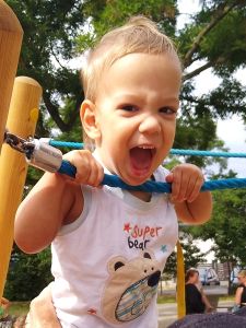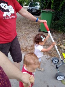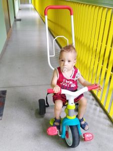 At about 5 pm we left to go back home. Tammy ended up pushing the tricycle, while Emmy was on my shoulders, and then walking at my hand. Back home they went downstairs to play, while I made their food. At their regular 6 pm time they came upstairs to eat. Then they went into the bathtub, and as expected, Emmy immediately wanted out. He was just too tired. However, then the girl wanted out as well, which is not typical. And so Sammy was the only one left in the water. And he insisted on playing with the faucet, while I was putting food into his mouth. He had so much fun that he was crying hard, when I got him out of the water.