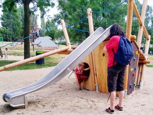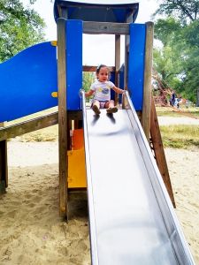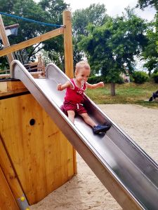 Emmy sat on the tricycle on the way to the playground, and Tammy on the way home. We went to the big one about a 10 minute walk away. It was a cooler day today, and not as many kids as last time, though a big group arrived just before we left. As always they had a lot of fun. From slide to swing to the spring animal and climbing. They did it all. It's all sand there, and there's always some sandbox toys lying around. Tammy was playing with a little bucket and shovel one time, and when another girl her age came, she handed them to her. How sweet of Tammy! She also sat on a spring with four seats together with a girl who was quite a bit older, and greatly enjoyed her interaction.