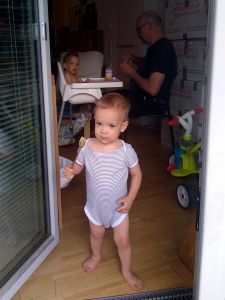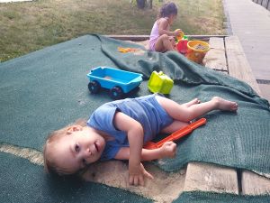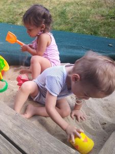 Just before 5 pm I went downstairs to give Randy a break and spend some quality time with the little ones. Emmy went straight to the door, pointing at it, and so I opened it and let them go outside. They ended up in the sandbox that Tammy asked me to open up, and had fun playing with the sand. Tammy filled up two buckets with sand, being very concentrated doing so. Sammy put sand into his mouth, which was not so good. And Emmy started running down the tarp to the end, and throwing sand there. Then Tammy joined in, and running on the sand is really not that easy.