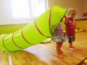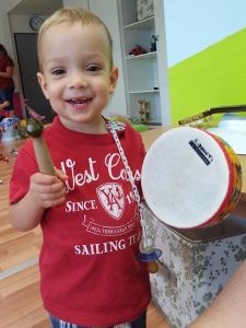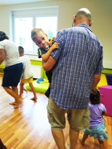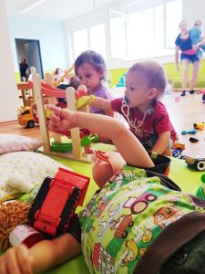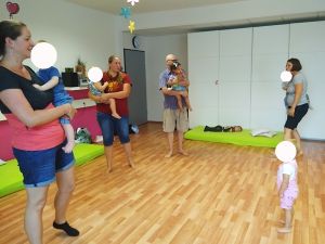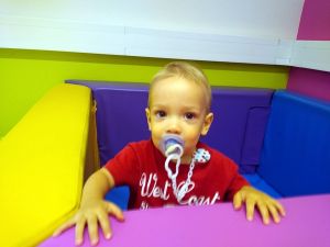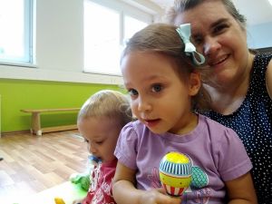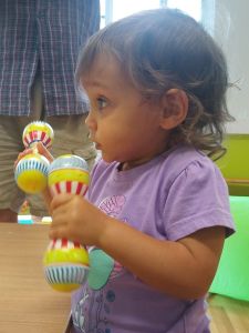 After snack time it's playtime again. Emmy found the box of rattles, and there was one tambourine inside that I gave him, and so he started drumming. Tammy also got herself some rattles. She also found the horse to ride on. They were having fun, and a few minutes before the end, the teacher returned to do a few more songs - walking in a circle, as well as sitting down. I had Emmy who quickly decided to go to the ball pit (without balls) instead of doing the dance. And Tammy was with Daddy and wanted him to carry her, like most kids at that point. Then the class was over, and we loaded them back into the strollers to go home.