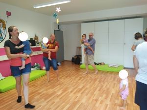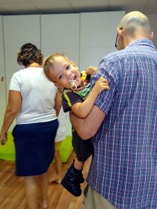 After breakfast I picked out clothes for them, we dressed them, and got ready to leave. In Austria you have to get Covid tests to go places if you're not vaccinated, and we need them for swim class, dance class and Sammy's physiotherapy sessions. We can take the test at home and carry the vial to a drop-off place, which is what we usually do. Yesterday we dropped it off late, and so we did not have our results this morning that we needed for dance class. Just in case I had already booked an appointment at a pharmacy on the way to dance class to get tested, as you get the results within 30 minutes. This way at least I would get to go inside with them; Randy refuses to let anybody stick a Q-tip up his nose, so he would have to wait outside for us.