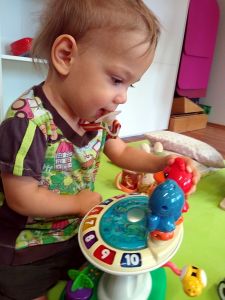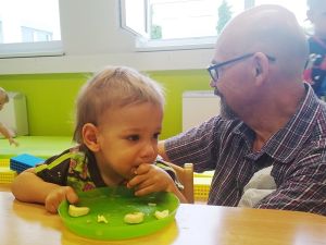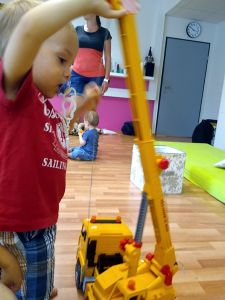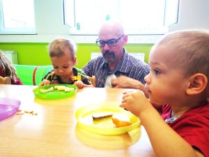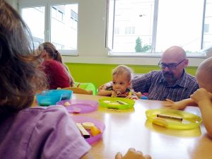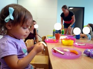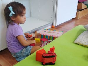 Then it was playtime. They can get any toy they want out of the closets, and it doesn't take long before toys are everywhere. While they're playing, the teacher is getting their snacks ready. Tammy was once again one of the first to sit down at the table. And they ate a lot again, even Sammy. There is bread with ham or cheese, and Tammy got the bread but then only ate the ham or cheese and left the bread. I gave the bread with butter to Emmy, who ate it.