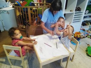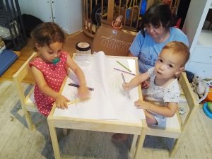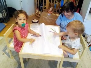 After the phone call, they wanted the table down, and the chairs, and then the paper and crayons. Sonja said that that was the third time today that they sat down to draw.