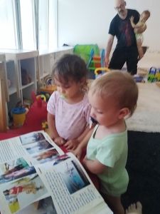 Emmy wanted to look at a photobook right away, and so we did. They looked at a lot of pictures but stayed on the page from when we went to the zoo. Sammy was on the couch and standing leaning against the back of it, and then crawled to the side, where he could pull himself up to a standing position, though he didn't do it. Emmy wanted to do some drawing next, so we put up the table and chairs and got the paper and crayons out. They all did a great job drawing. Sammy likes grabbing the paper and pulling it away, which the others do not appreciate.