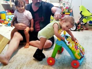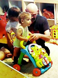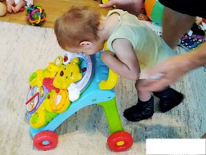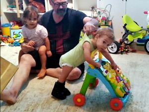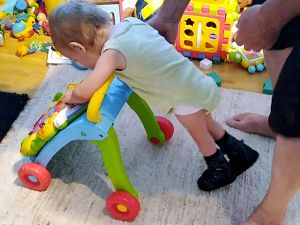 Then I put Sammy into the swing, which he really enjoyed, the wilder the better, and then Emmy went in. Then Randy came downstairs with Sammy's shoes. He told me that Sammy had done three rounds of the living room walking this morning, without his shoes, with the Winnie the Pooh walker. I wanted to see that for myself. I figured it'd be easier for him with his shoes, even though they are made for standing, not walking. And I was really impressed (videos uploaded). He did great! He was leaning over the walker, moving his legs. Randy made sure he was there to catch him so he would not fall. He really did great, and we're confident he's gonna walk one day, even though the doctors said he wouldn't. Every night when I pray for him before going to bed, I prophesy over him that he would run.