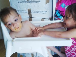 I opened the balcony door, and Sonja went outside with their jar, while Randy sat right inside with Sammy. I also gave her the bubbles to blow, and then went to get some fruit for them. After they were done eating and Randy had gotten off his chair for some reason, Tammy sat down on it. She's put food into her brothers' mouths before. Then they all went downstairs to play, while I went back to work. I'm still setting up my new computer, which is just so time-consuming.