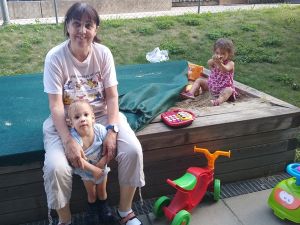 With my mounting frustration and dead ends everywhere, I finally quit and went downstairs to be with my sunshines. Randy had left to pick something up from the store (which was out of stock anyway). I had one hour of fun with them. I took down all their shoes with me, already knowing they would want to go outside, which they did. They wanted the cars out, and Tammy enjoys the sandbox. Sammy was rather cranky and wouldn't just be by himself.