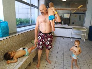 I started with Emmy today, and Sonja and I switched quite a lot between the two. Emmy did better again regarding his fear. He enjoyed jumping into the pool, as did his sister, and got pretty comfortable in the swim ring. They were all having fun, and I once left the water to take a picture. I think he lets us stay in there longer than the class is, as there is no clear beginning or end, with people coming and going. He had them go through a tunnel today that he sat on the steps into the water, so they could simply walk through, and they both did it with no trouble at all.