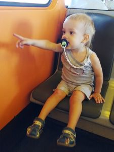 Then we went to the showers, and Emmy loved them, enjoying the shower so much, while he's scared of it at home. It took us a while to get everyone dressed and be ready to leave. I gave them some snacks, and we started walking to the train station. It was a little cooler today, so we just passed the water coming out of the ground. Thankfully they were not too upset about it. We had to say goodbye to Sonja and got on a train, and then took the subway back home. They always come out of their seats, and Emmy wants to have his own seat, and does not want me to hold him at all or put my hand on him to protect him in case of sudden stops.