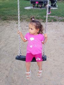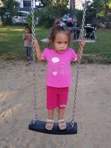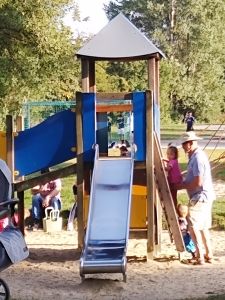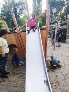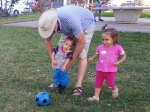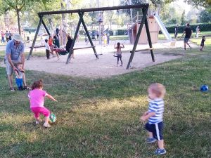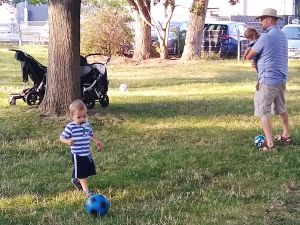 It was the last warm and nice day, and so we had to take advantage of it. We walked the 12 minutes to the closest decent-size playground. As it was Sunday, there were a lot of children there, and they got right into it. We started by the smaller slide and swing, then moved around a little, and I got stuck at the regular swing with Tammy. She quietly sat on the swing that I pushed and stayed there for a long time. Then Randy and the boys came our way, together with the two balls we had brought, and we all started playing ball/soccer together. Sammy loves playing soccer. A group of people was doing a birthday party, and they had lots of balloons that Emmy really wanted. It was 5:15, and we decided it was time to walk back home.
