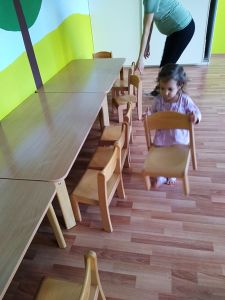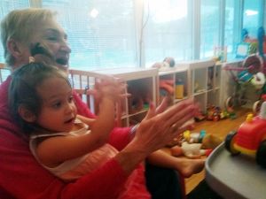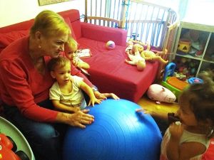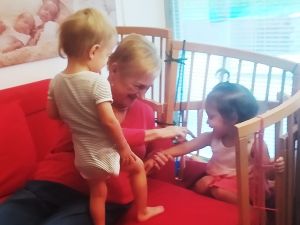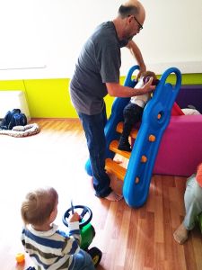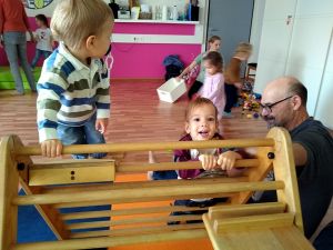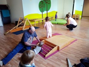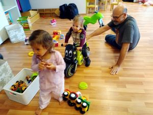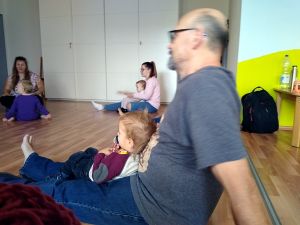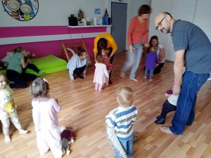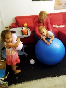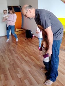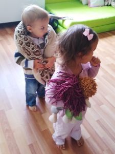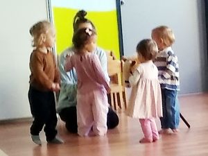She also did a song, where they hide different body parts, and both of them did that. In the end she had the kids all run at the same time to her at the other end of the room and back, and they did a great job doing so. They were having great fun.