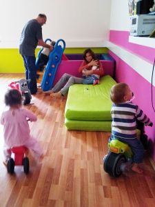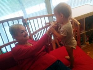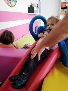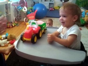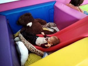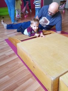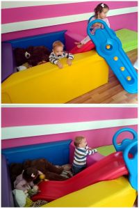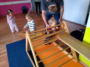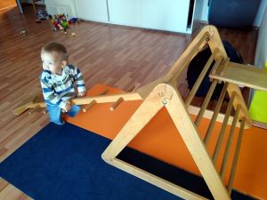 Then she set up an obstacle course and started playtime. They were all having great fun climbing and playing and riding motorcycles, as well as going down the slide and jumping off the table onto the mattress. Sammy had great fun too. He climbed up the ladder with Daddy's help, and impressed me with the way he was walking with Daddy holding his hands and holding him up.