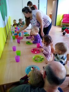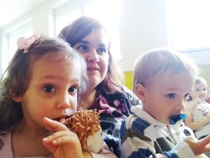 The last few minutes the teacher was getting their food ready, and then a Mom started putting the tables and chairs up. Tammy immediately joined in, putting the chairs by the table. She loves helping. But she also shocked me, when she pulled Sammy down the ramp by his hair! Then all the kids sat down by the table, and the teacher brought out plates of food. All three started eating and ate a good bit, then they left to go back to playing. But there wasn't much time left. The teacher sang a good-bye song with them and then got her stickers out that every child could choose one from to put into their little participation booklets. Then it was time to put our shoes on and go back home. We had to walk to the bus stop, and then ran, when we saw the bus approaching, and made it.