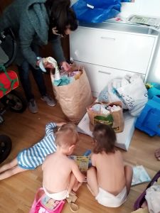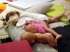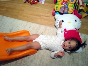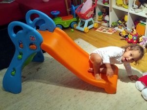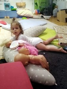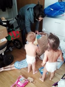 I thought it would be easy to get them to sleep, but Emmy was as awake as if it had been noon. Once again I was trying everything I knew to try to get him to sleep, but to no avail. By 1:15 Sammy had finally fallen asleep. As for Emmy, it took him until about 1:35. And so it was 1:40. before Tammy went to bed. It took her nearly until 2 pm to fall asleep. A few minutes later Sammy was already awake, which did not make Daddy happy who had only had a few minutes of a break. A few minutes later he went downstairs with Sammy. They returned just before 3 pm, and the noise was enough to wake first Emmy up, and then Tammy. I was feeding Tammy the jar Sammy had not wanted, while Randy was getting ready to leave with Sammy to take him to his physiotherapy session. They left at 3:15 pm, and I went downstairs with Tammy and Emmy to play.