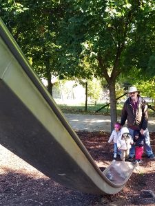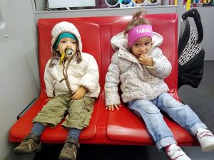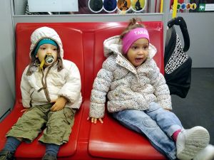 We got on the bus and went down the mountain, then got on the subway, and then another subway. At 1 pm we were back home. Emmy had fallen asleep in the stroller, but was up by the time we were home. I warmed up some food, and we sat down at the table to eat. Both Tammy and Emmy ate some pasta but no fish. Tammy was clearly pretty tired. Emmy too; he wouldn't even eat a pudding, which is unusual. I dressed them both again - no water games - and put them to bed, and Sammy joined them only minutes later. I thought they'd all be asleep soon, but that was not the case. Tammy was having fun with Sammy, keeping Sammy up. Emmy wanted me to hold him, which I did. I tried to put him to bed a few times. Randy was making omelets for us, while I was trying to get them to sleep. It was pretty frustrating. Once the food was ready, it was Randy who sat down by their beds. At least Sammy had fallen asleep, but it was becoming clear that the other two were not gonna sleep. Randy finally went downstairs with them, and when Sammy woke up later, I took him downstairs to them.