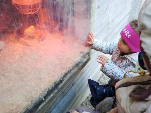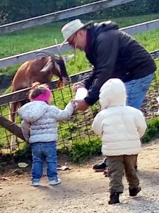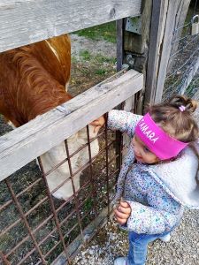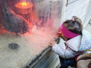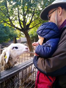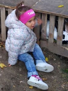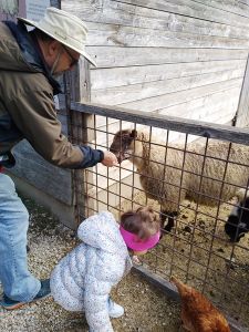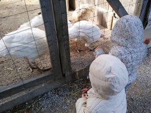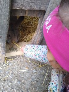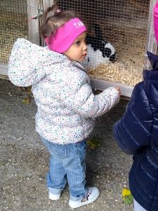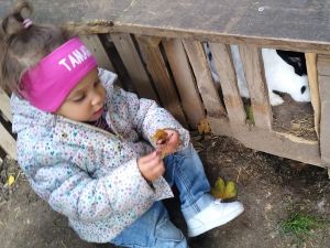 We took two subways and then a bus, a one-hour trip in total, before we arrived at the petting zoo. We had been there once before, when it was warm, but today was a sunny day, though a little chilly, and I thought it would be our last chance to go there before winter. Last time there were dozens of rabbits outside, and as much as Tammy loves rabbits, I wanted to give her that experience again. The rabbits were the first animals we headed to. When we got there, there were no rabbits outside. I guess it was too cold for them, so that was really disappointing. There were a few rabbits near the openings, and that's all the interaction they got. We had some animal feed that we gave to them.
