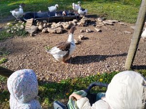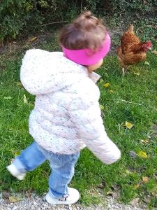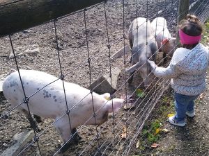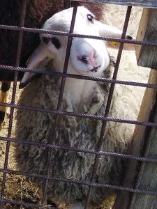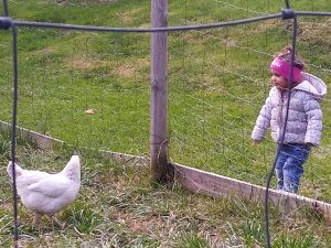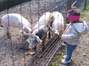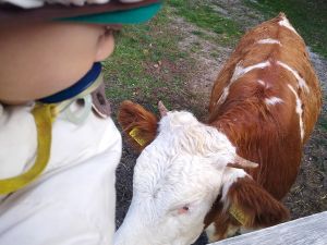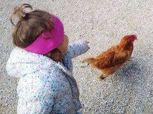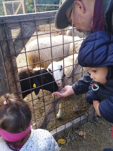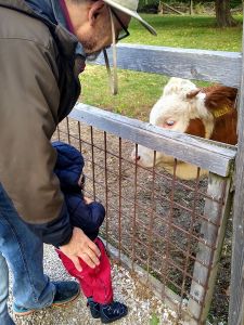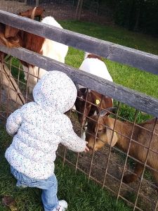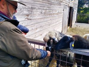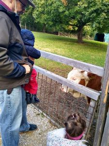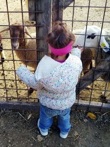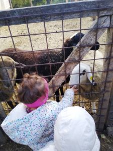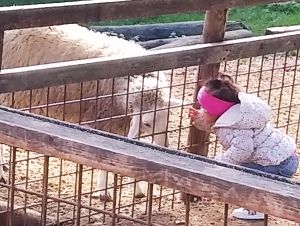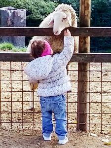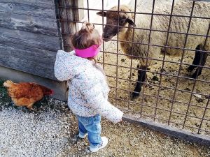 Next we saw the cows. There was one by the fence, and it was really tame, letting us pet it. Next were the sheep. There was a chicken on the path on the way there, and Tammy tried to touch it, but it ran away. Then we got to the sheep. Tammy was fearless as ever, trying to feed them and pet them. Emmy was fearful again, but at least I didn't have to hold him. He was happy just holding my hand and kept a safe distance to the animals most of the time.
