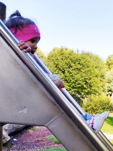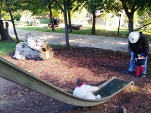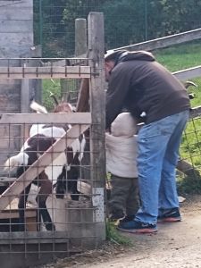 After the sheep we got to the pigs, and then the goats. That's where Emmy fed them for the first time, with Daddy's help. We moved on and saw the turkeys, and then baby chickens. They were in a heated box, and the kids loved watching the little chicks. Next we saw geese, and then we got to a steep slide on the sloped mountain. Tammy went up first and had no problem sliding down. Emmy went up next. Neither one has any problem climbing up the ladder now. Randy also put Sammy on the slide a few times.