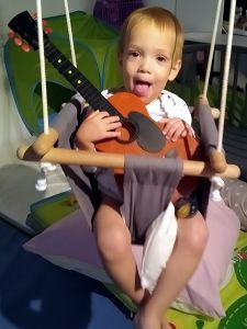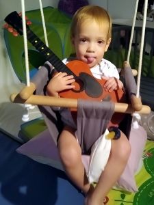 I returned to work. Then Tammy woke up, and I took her downstairs as well. And then I heard Emmy crying hard at the gate downstairs, and finally went downstairs to comfort him and allowed him to go upstairs with me. He sat on the bed with me. I was trying to work, while I turned videos on my phone on that they love watching. After a few minutes of "Barbapapa", he wanted to see sheep videos, which he enjoys so much. After some time I decided it was time to take him back downstairs, which he was not excited about. It wasn't long before he was back at the gate crying for me, but Randy picked him up. Still, after I had finished a big job, I decided it was time to go downstairs and spend time with them. Both boys still had a fever, and Emmy was cranky. I gave him his guitar that he likes so much, and he sat in the swing playing it. Tammy is already over the fever, but still has a runny nose and is hoarse. She was having fun. Sammy was also doing pretty well considering. After half an hour they wanted to call Grandma, and so we did. They were having fun talking to her. By the time we hung up it was already 5:30. I told them it was time to clean up. Tammy helped a little bit, but Emmy never helps. After we were done, we all went upstairs together.
