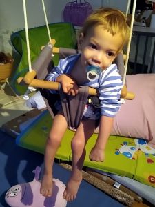 She was also the first one up and on the way to the bathtub. Nothing but strawberries were eaten there. Even Sammy did not want to eat much of his food. After they had played for a while, it was time for Sammy to come out. We gave him his medicine and put his pj's on, as well as his night braces, and put him to bed. Then I gave Emmy his medicine to drink, and he drank it thanks to the 5c reward dangling in front of his nose. He was still in the bathtub, and Tammy was watching him. I got another 5c coin and her piggy bank, and once again asked her if she wanted to drink it as well and get the money. She was hesitating again, like she had done before, and suddenly she actually drank it! Wow! I had not expected that. But there was still the second medicine that was liquid. I poured it into the cup, and lo and behold, she drank it too! I told her how proud I was and gave her the coin that she proudly put into her piggy bank. Let's hope she'll continue like that tomorrow!