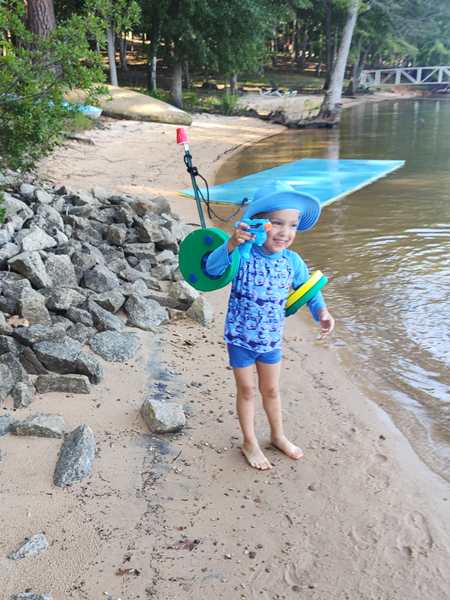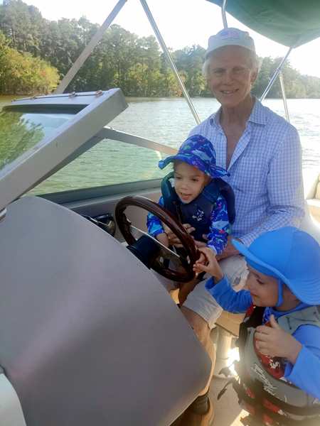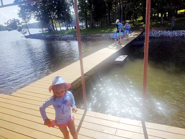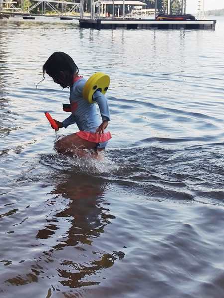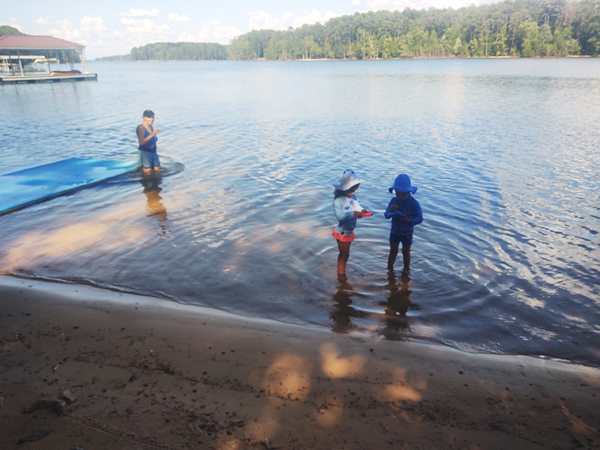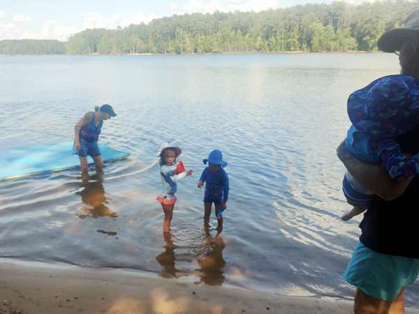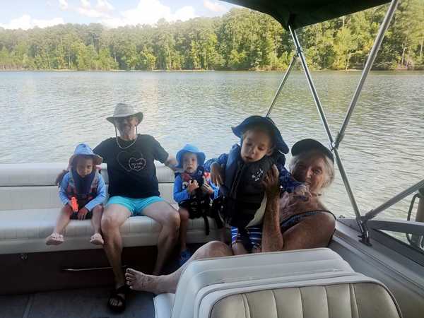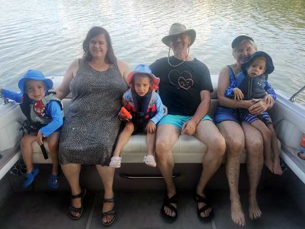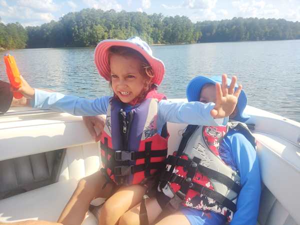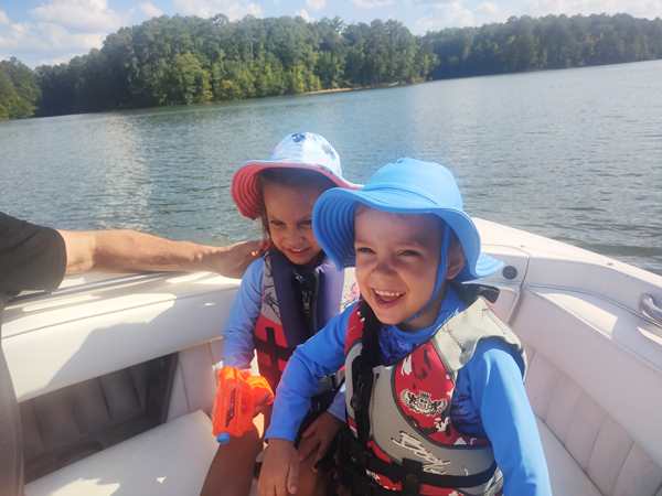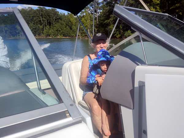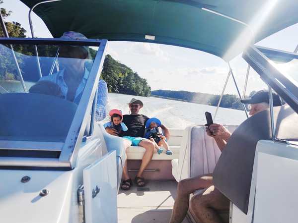 However, they were eager to go into the lake and on their boat ride. We put the sun-blocking bathing suits on them that our friend had given them, and they loved them. While our friend was removing the tarp from the boat, they were already in the water. Then we walked to the boat and got on for our ride. Sammy was eager to steer a boat again and got to do so. I went to the front with Tammy and Emmy, and they stayed with me for a while before returning to the back, where Randy was.