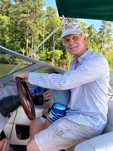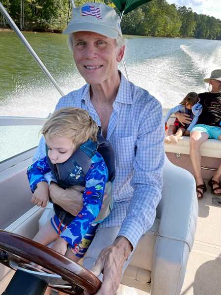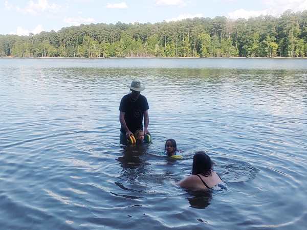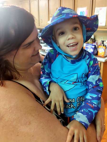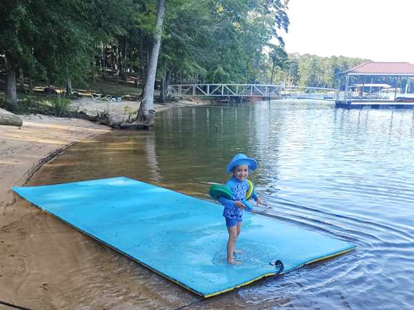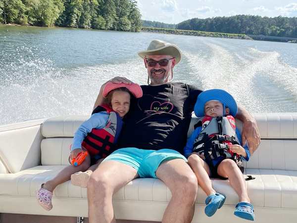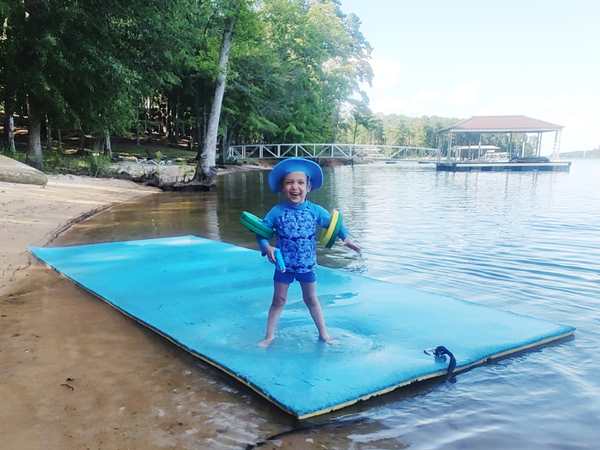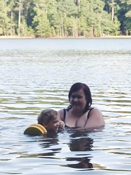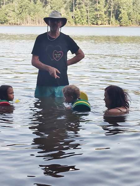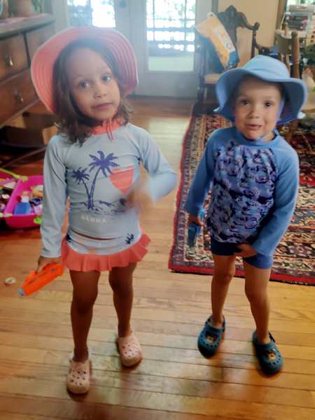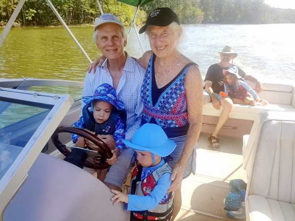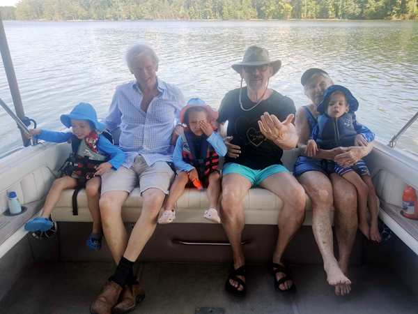 However, they were eager to go into the lake and on their boat ride. We put the sun-blocking bathing suits on them that our friend had given them, and they loved them. While our friend was removing the tarp from the boat, they were already in the water. Then we walked to the boat and got on for our ride. Sammy was eager to steer a boat again and got to do so. I went to the front with Tammy and Emmy, and they stayed with me for a while before returning to the back, where Randy was.