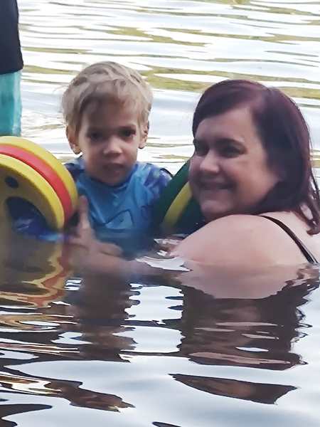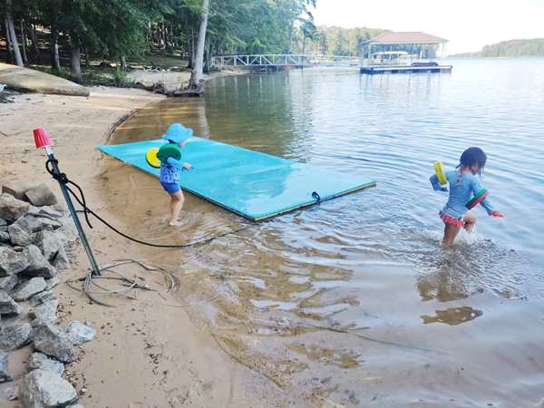 After a short round-trip we docked again, and the kids finally got to go into the water, and so did I. For the first time even though I've been coming here for about 15 years. I just don't like natural lakes. The bottom was sandy, but there were also stones and algae. Emmy wasn't happy either and then put his plastic shoes on. They were having lots of fun in the water, including Sammy. After some time Sammy had had enough, and so I returned to the house with him. He was cold, given the fever, and so I gave him a hot shower. Then I dressed him and even put a jacket on him before putting him into bed and covering him up. He was happy, when I gave him the tablet to watch children's songs. It was just the two of us for a while before the others returned, and I gave them a bath as well.