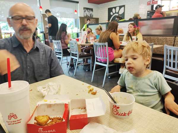 Sammy had already briefly slept before stopping there, but he still had a fever today and was visibly tired, and he was cranky. He was asking for our friend Marsha again, and so I decided to call her. He was so happy to see her, but when I hung up, he immediately broke into tears, crying hard. We left the restaurant, and I ended up calling our friends again to calm Sammy down. Of course we had to hung up again, and then strapped everyone into their car seats. It was time to move on.