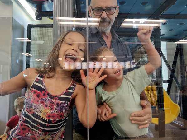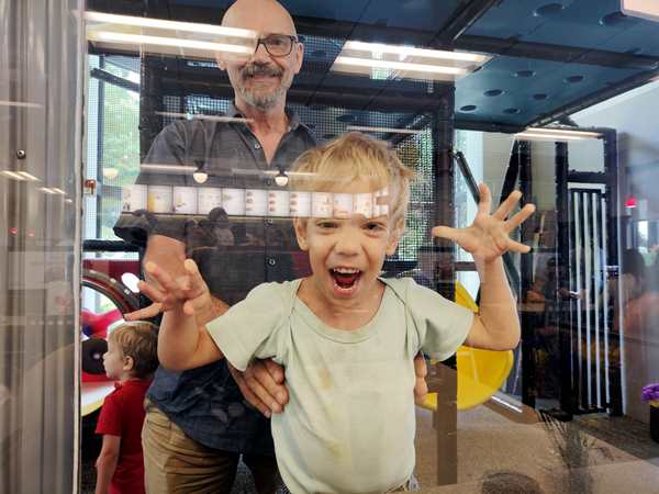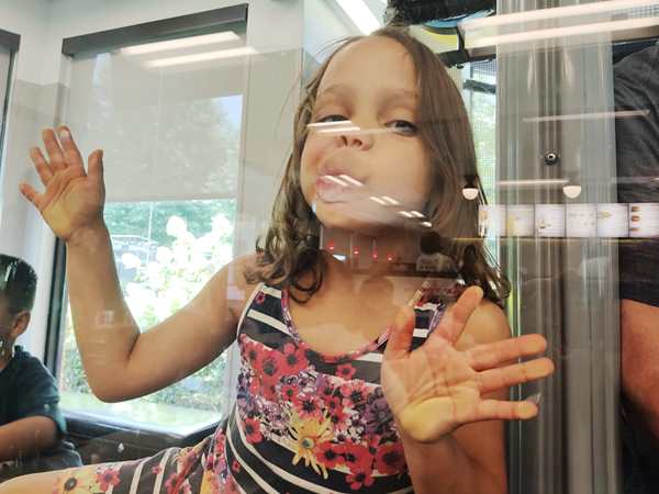 We drove nearly 3 hours before we stopped for the first time. It was 12:20, and we had found a Chick-fil-A just before Charlotte, NC, that was along our route to go to for lunch. By the time we stopped, they really needed to get out of the seats again, especially Sammy who starts getting really cranky not long before a planned stop. The restaurant was filled to capacity, so that we did not get a parking spot right away, nor a table to eat at. The kids started playing at their playground right away, and soon a table right there became available to us. The kids were more interested in playing and running at first, but then sat down to get some food. Sammy wanted to play too and enjoyed looking at me through the glass.